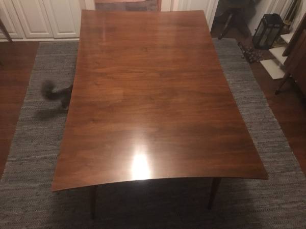 Mid Century Bow Tie dining table designed by Giacomo Buzzitta for Stow & Davis. Table is in excellent condition. Top has a few small nicks and scratches. Corners are a little nicked and edges have some scuff marks. Table is 40 inches wide, 5 feet long. Table opens to 8 feet long, however I have no leaves for it. Stow and Davis makers tag is attached underneath. Overall piece is in excellent condition. The signed Niels Koefoed dining chairs in the photo are listed for sale also.