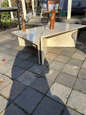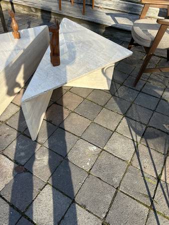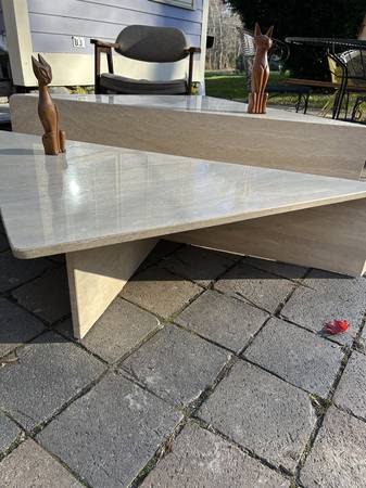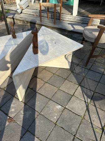 Super post modern travertine table set. Uber Po-Mo as the kids say (pretty sure I heard a kid say that). Pair is in excellent condition. There is some wear on the larger one where the top meets the side. Each has a few small chips at the bottom corners. They are very heavy and were probably chipped moving. Overall excellent condition and a very unique look.