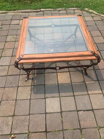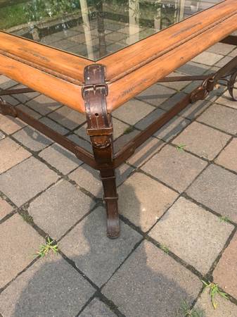 Vintage iron and glass coffee table in the style of Jacques Adnet as designed for Hermes. Legs are wrought steel or iron with the appearance of leather straps. Table is in excellent condition. The exposed screw that attaches one strap is loose. The others appear to have some sort of wood putty sort of fill, it does not. Glass has a few scratches but overall excellent condition.