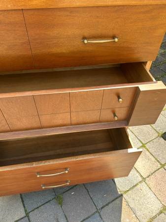 Johnson Carper Fashion Trend dresser. The previous owner had the matching dresser with the fashion trend label inside; this piece is not marked. Piece is in very good condition. Finish has some minor scuffs and scratches. Drawers are pretty deep and the bottom drawer is extra deep as shown in the photos. The sides are a little bowed and loose on the bottom drawer so it sticks a little. There is a chip out of the top on one side. Overall very good condition.