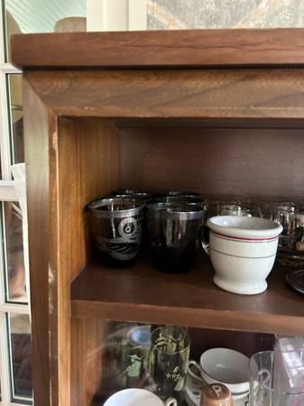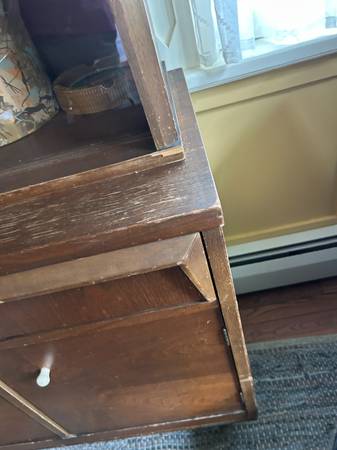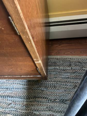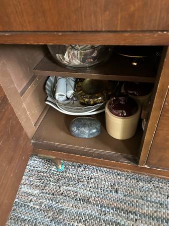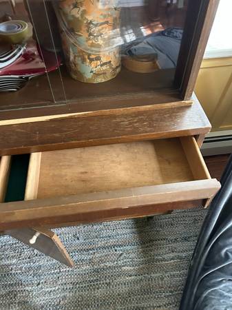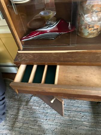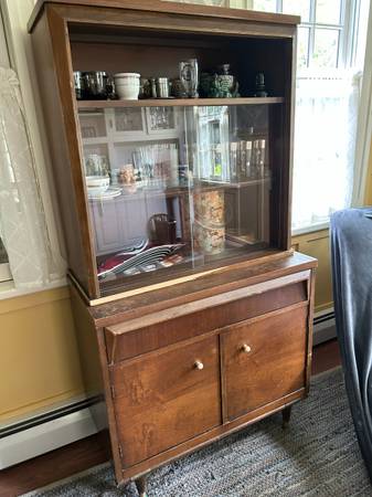 2 piece mid-century hutch with glass doors. This isn't marked but I am pretty sure it's made by Bassett. Piece needs a little work but overall pretty good condition. The edge-banding is damaged or missing in several spots. Finish has some scuffs and scratches. Brass feet are tarnished. Top comes off and base can be used as a credenza. Piece needs some work but overall pretty good condition.