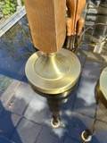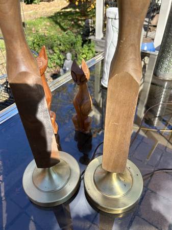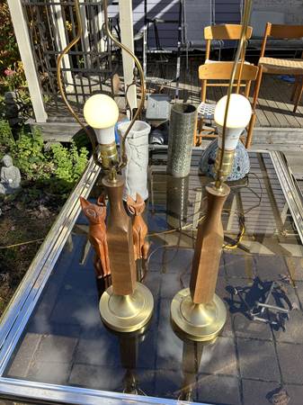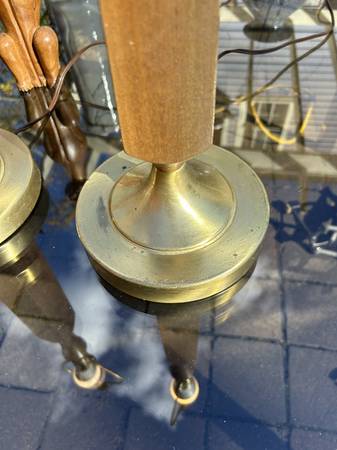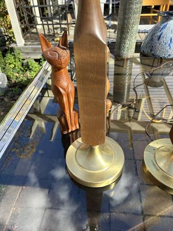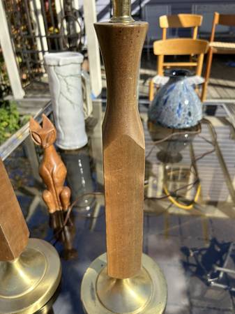 Mid-century / Danish Modern walnut and brass table lamps. I have seen this lamp sold as teak and I am not 100% sure of the type. Pair is in pretty good condition. The metal is tarnished and a few spots may be permanent. The harps are what were with them, and one is missing the finial. Both lamps work as shown in the photos and wiring seems fully intact but re-wiring is your call.