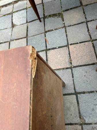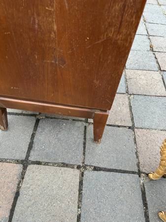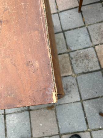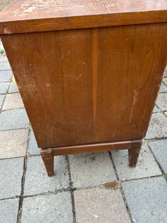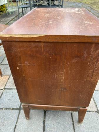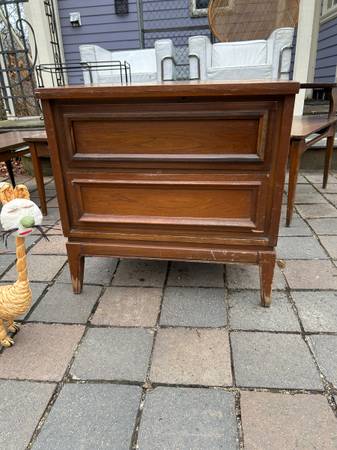 2 Drawer Mid Century nightstand by Dixie furniture. Piece is in fair condition and is being sold for restoration. Top will need to be stripped, and edge-banding replaced. Sides are not as worn. For some inexplicable reasons drawers are not an exact match, the pull profile is a little different. Piece needs some work but a good look and worth the effort.