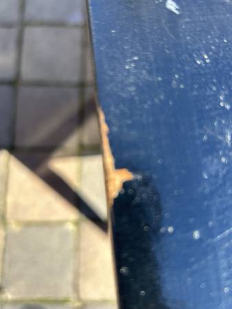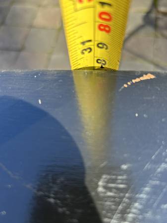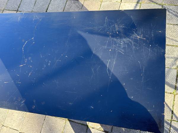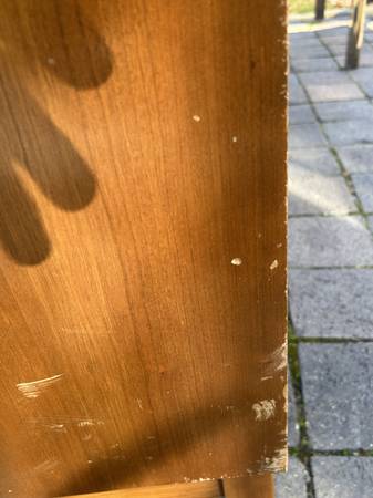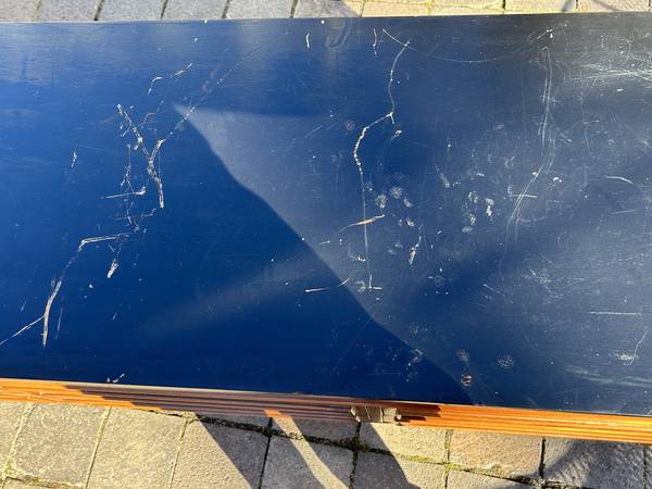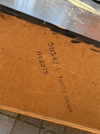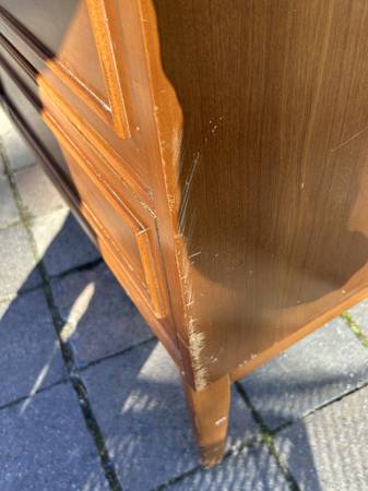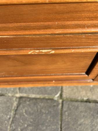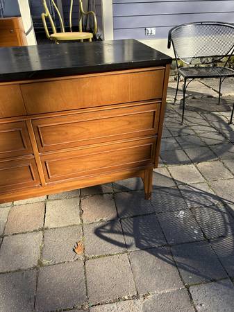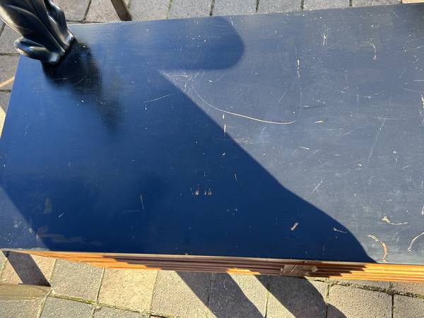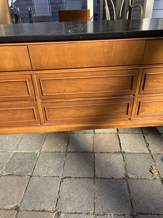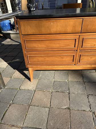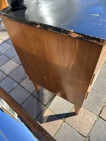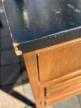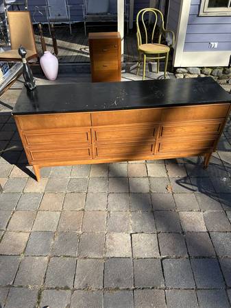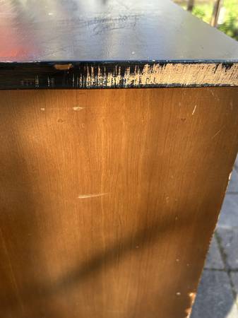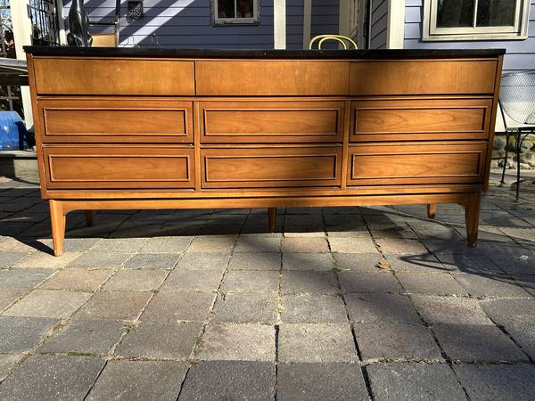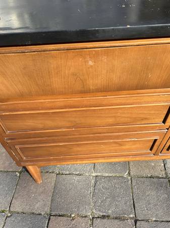 9 drawer low dresser by with painted black top. This is the rare 5 leg version. Piece is in fair condition needing some cleaning up. Someone has painted the top and the paint is now scratched. You could either (A) repaint the top or (2) strip the paint and repair / replace the veneer beneath it. There are some small chips to the edges of the painted top. Drawer fronts have some small dents and scratches but overall very good. Sides are scuffed up but I think they could be cleaned up without new veneer. It needs some work but overall pretty good.