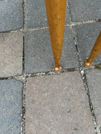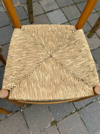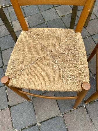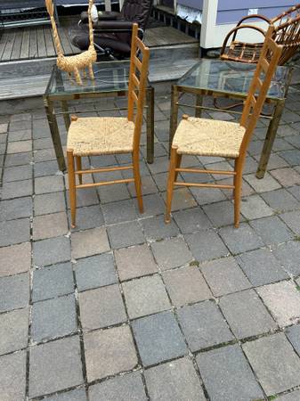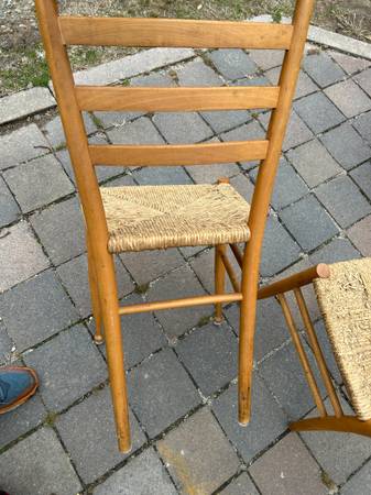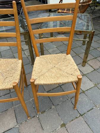Pair of Italian ladderback chairs with woven rush seats. Pair is in need of new seats as shown and are being sold for restoration. Top rung on one chairs has a scratch shown in the photos. The feet are a little nicked up. Frames a re slightly wiggly but overall structurally sound.
