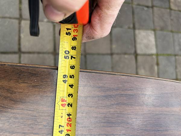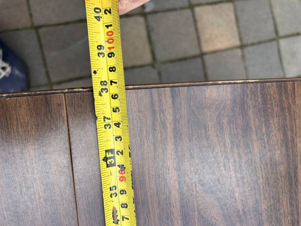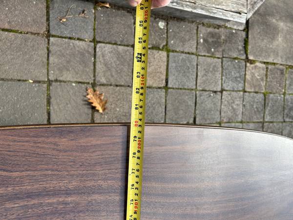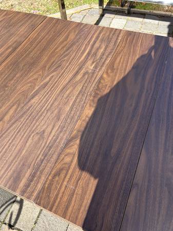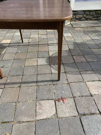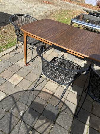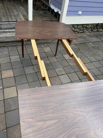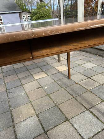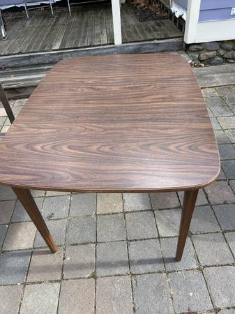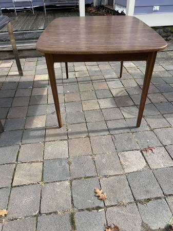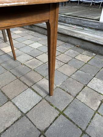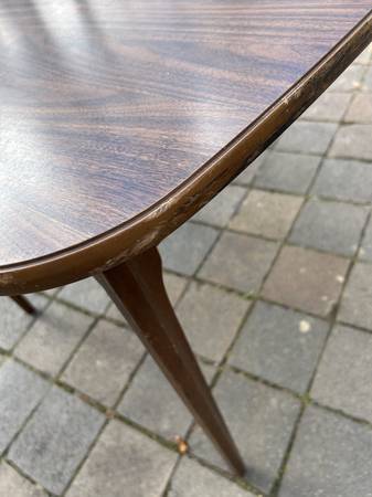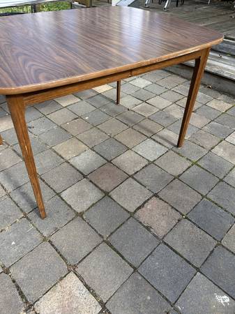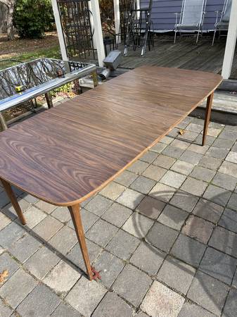Mid Century extending dining table with laminate top and 3 leaves. Table is in pretty good condition. Piece has nice wood legs. Laminate top has some scratches. Edge banding is scuffed up, it's readily available on E-bay or Amazon. Table needs a little cleaning up but overall pretty good condition.