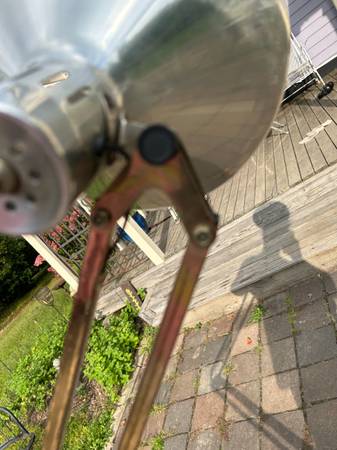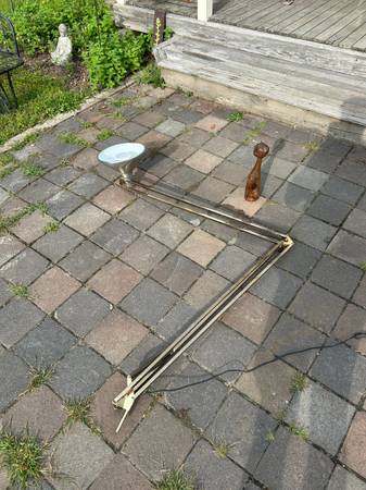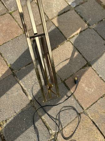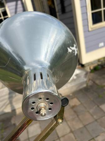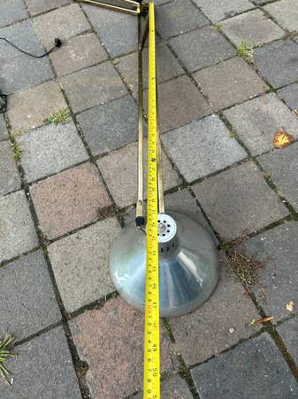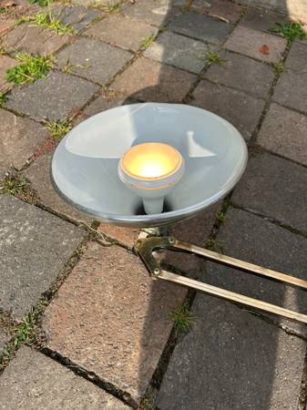 Vintage Luxo style adjustable lamp. This either had a clamp on table attachment or a floor base which I do not have. Piece is very good condition. There are the remains of a price tag sticker. Shade part has some small dents. It seems like all the adjustments work as does the light. Piece has a little wear but overall pretty good condition.