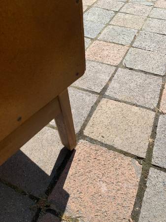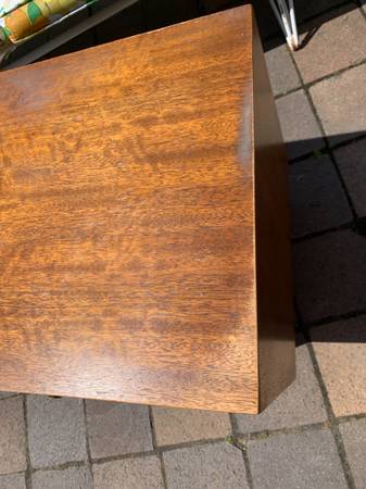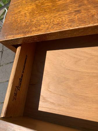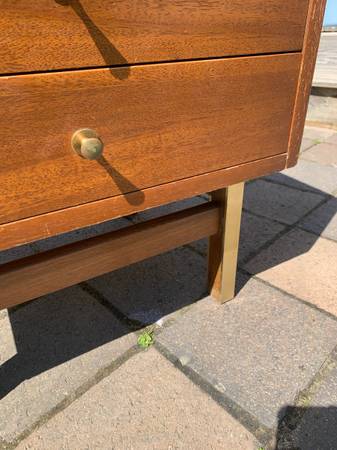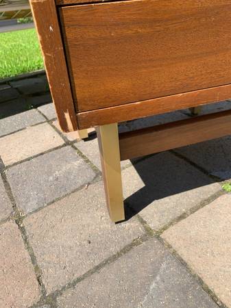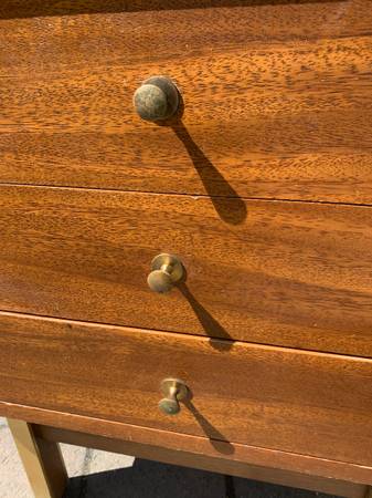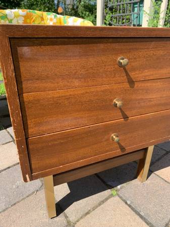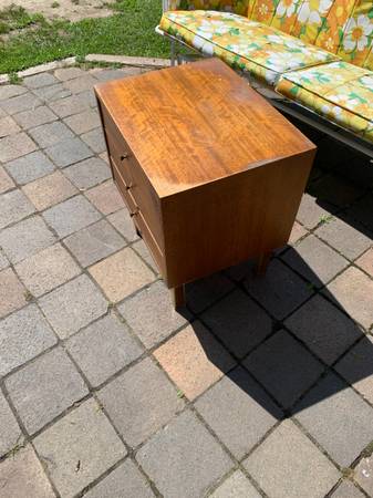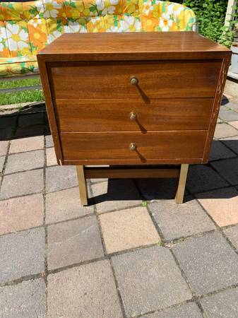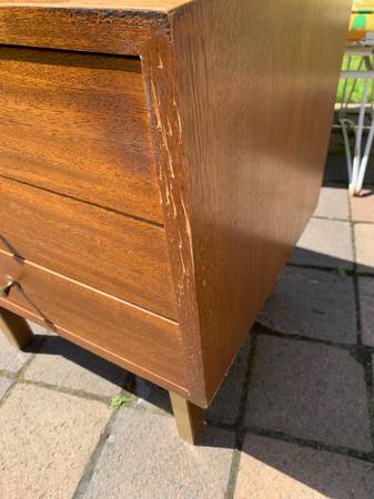 3 Drawer Mid Century nightstand by American of Martinsville. Piece is in good used condition. The veneer edgebanding on the front has a bunch of small nicks, presumably of kitty origin. I would just replace all of it. Veneer has some small chips and missing pieces. Finish is worn and will need to be cleaned up, mainly on the top. The finish has some scratches, nicks and light stains but overall pretty good condition.