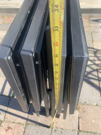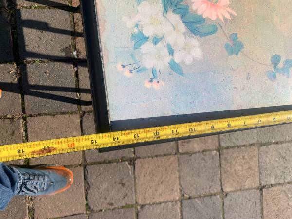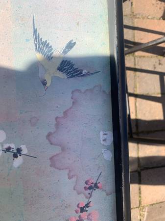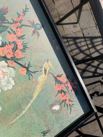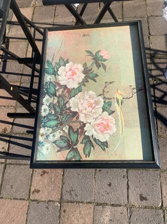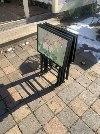 4 Artex folding television trays as shown. Frames are molded plastic and are in excellent condition. Picture area has a little damage on each one. Wood holder stand is a little scuffed up. Pieces have some wear but overall good condition.