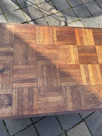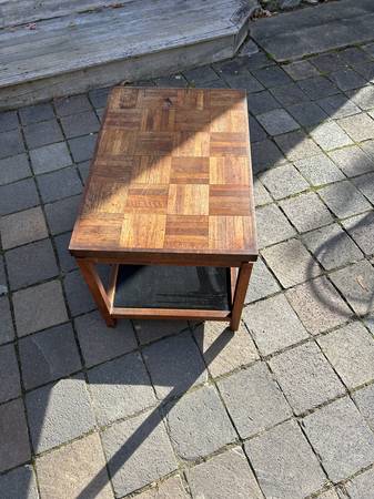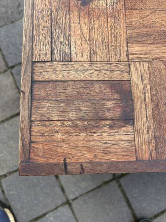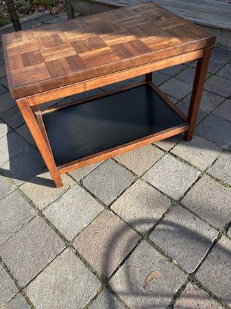 Walnut side table with a parquet sort of top. Piece is in good used condition showing some obvious wear. Top has some stains, nicks and burn spots. Legs have a few nicks and scratches. It's a little worn but a unique look.