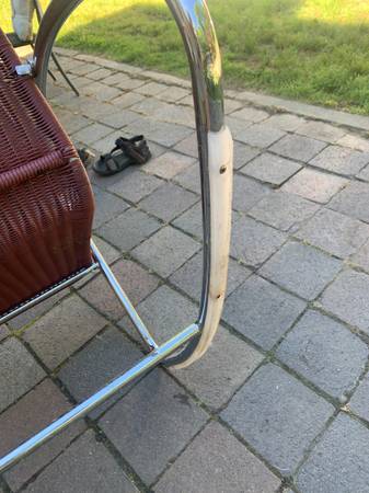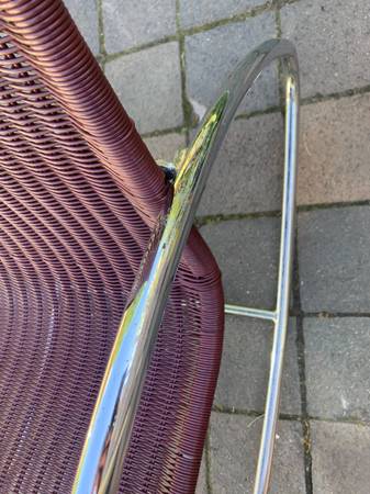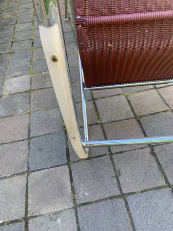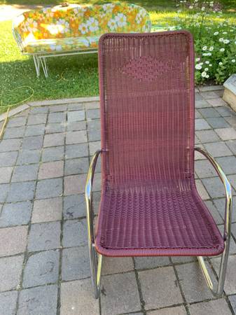 Tubular chrome rocking chair with woven plastic cord. I found no markings and don't really know anything about its age or origin. Piece is in very good used condition. Chrome has some tarnished / pitted spots shown in the photos. Seat is in excellent, near new condition. It is extremely comfortable. Overall piece is in very good condition.