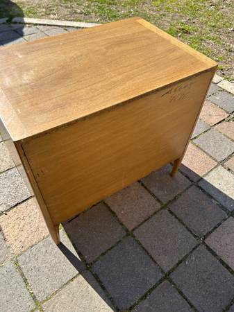 Midcentury nightstand by Mt Airy. I am pretty sure this is a John Stuart design. Piece is in very good condition. Top has a little wear and a few small scratches. Legs are a little nicked up. Interior of drawer has an ink stain. Piece needs a little cleaning up but overall very good.