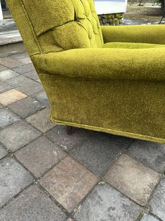 One of a kind vintage armchair. They don't make anything this color anymore. Piece is in fair used condition. There was a skirt covering the legs but it was stapled up and trimmed off. I would replace the front legs with longer ones to tilt it back. The upholstery is worn and has faded a little unevenly. Piece needs a thorough cleaning but a unique vintage look.