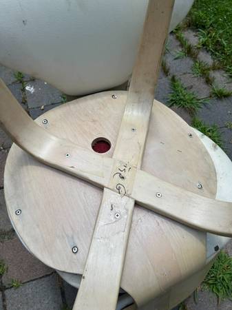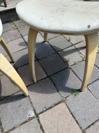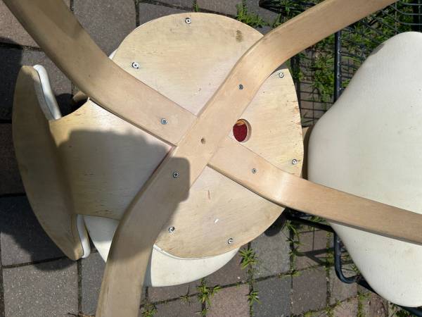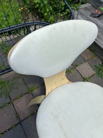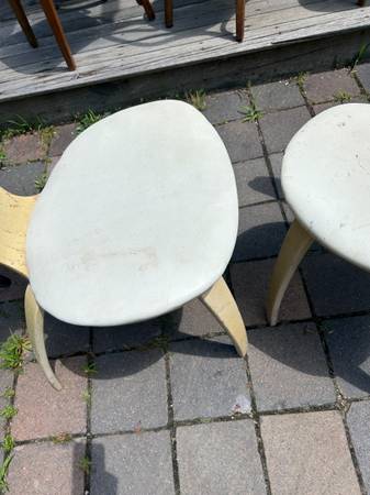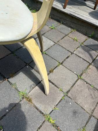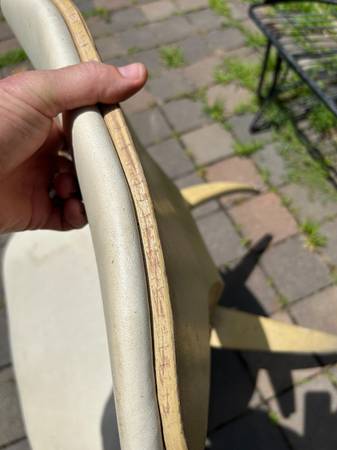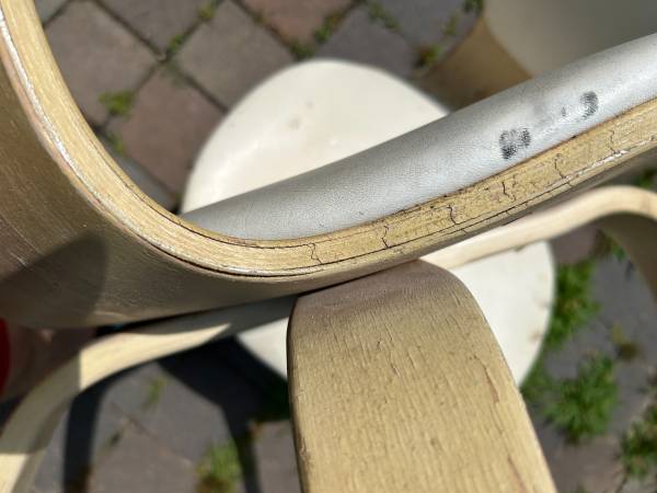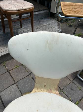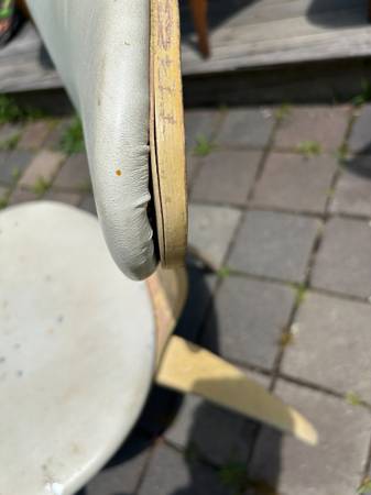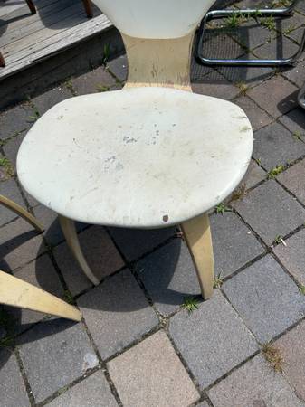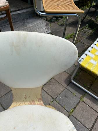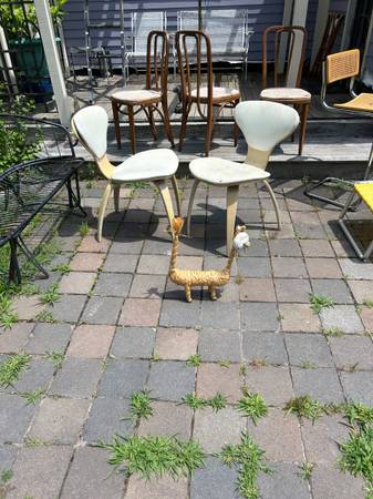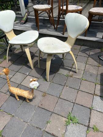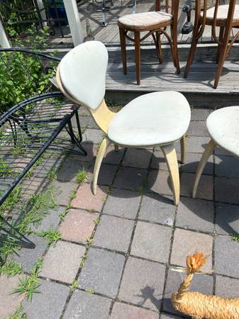 2 Norman Cherner plywood chairs in need of restoration. Chairs are not marked. Chairs have a few small splits in the plywood where the glue has failed. Padding is worn and stained with small tears in a few spots. Either original paint has worn or they were poorly repainted. Chairs need a little work but well worth the effort.