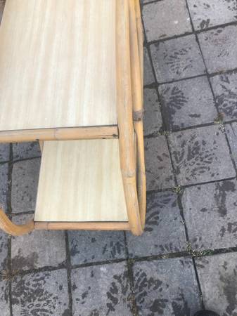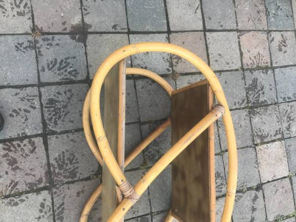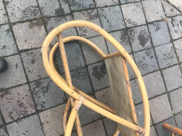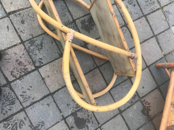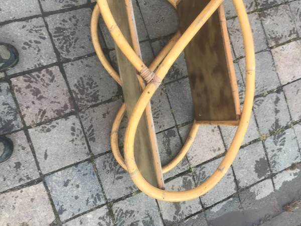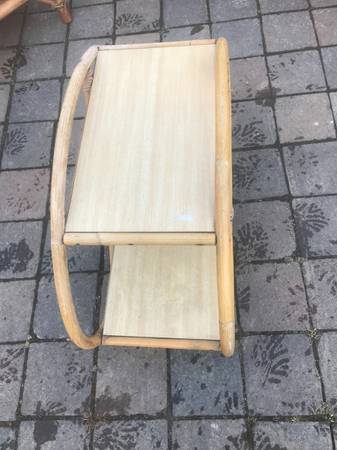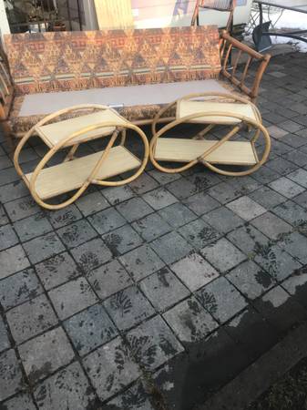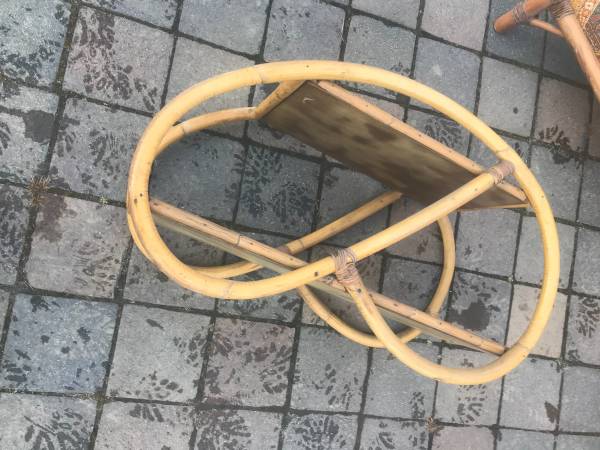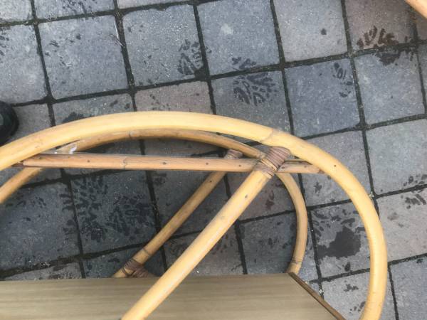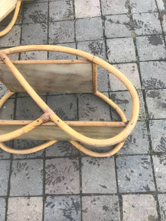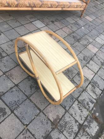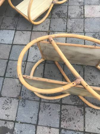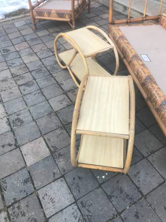 Pair of Paul Frankl / pretzel style side tables. This is the same style table Ferris Bueller rests his iced tea on poolside. (I think I have that same iced tea pitcher for sale also.) Pair is in used condition needing some repairs. A few of the wrapping pieces at the joints are damaged, or loose. There are some splits to the bamboo edging on the tabletops. One has something attached to the bottom, like someone tried to add a foot glide. they are a little rough but quite a unique addition to your Mid Century decor.