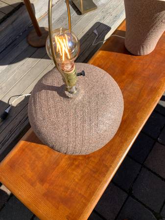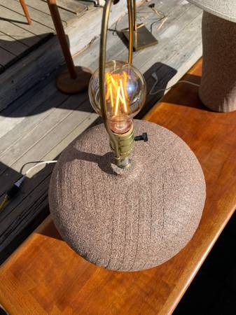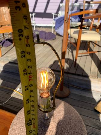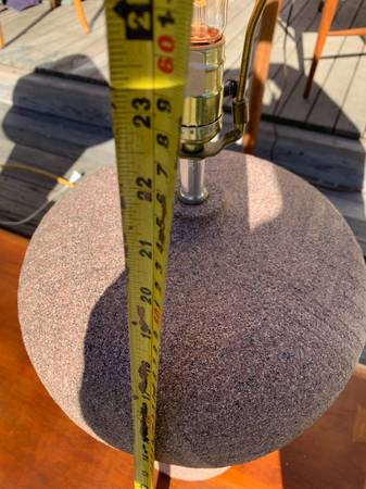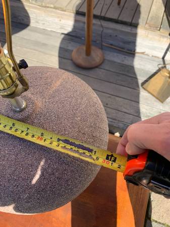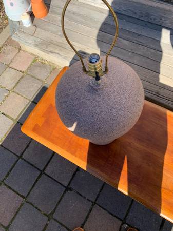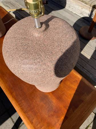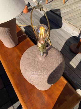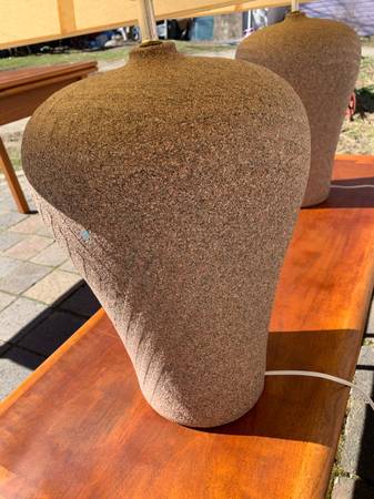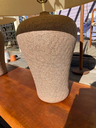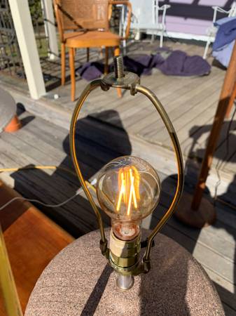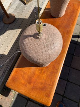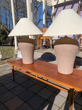 (2) Vintage table lamps as shown. Pair is in excellent near new condition. There are some small spots of a blue material stuck on the side of each and I will guess they were wrapped in a blue material, it is minor and will clean off. Metal harp parts have some tarnish. Shades are not perfect but included. I plugged them in and both lights work. Pair has a few little scuffs but overall like new condition.