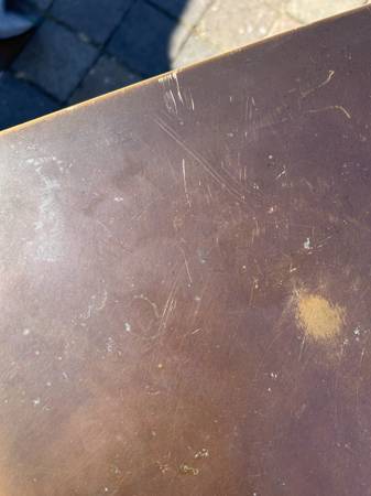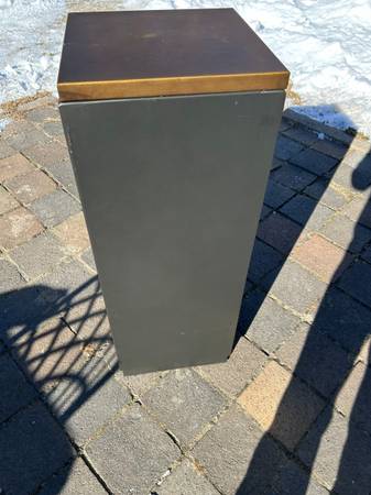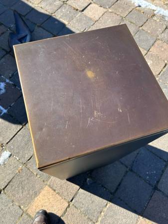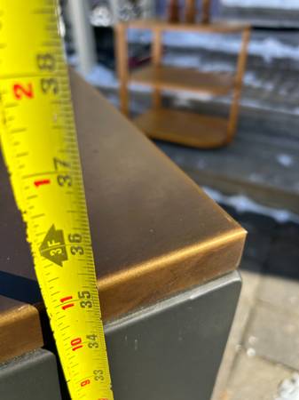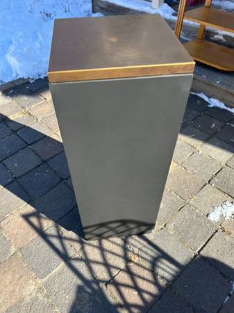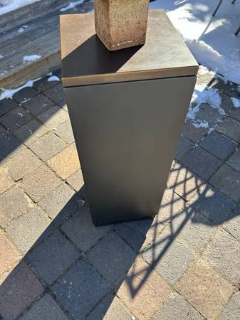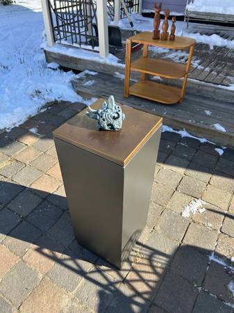 Vintage Post Modern metal display pedestal. West German studio pottery statue is listed separately. Piece is in good used condition. The copper finish is a little scratched up. There are some slightly peeling areas in the black paint. Metal has some scuffs and scratches it is otherwise very good.