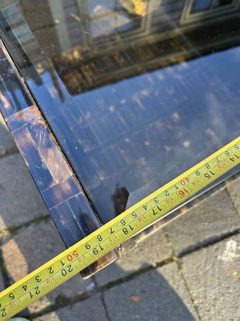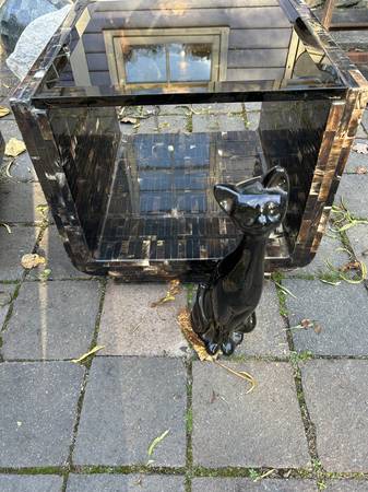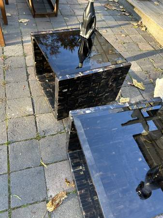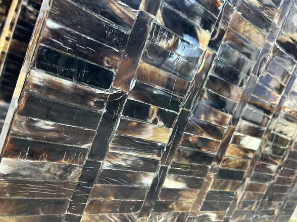 1989 Post Modern tessellated horn and smoked glass side tables labeled Jimeco. Pretty sure these were designed by Enrique Garcel. Pair is in very good condition. There are a couple of small cracks in the horn. There is a small square of it missing at the base. The glass has some scratches. They show a small amount of wear but overall very good.