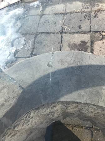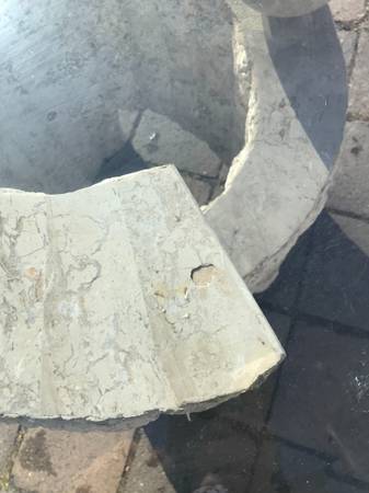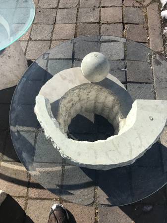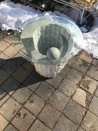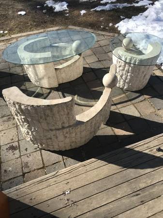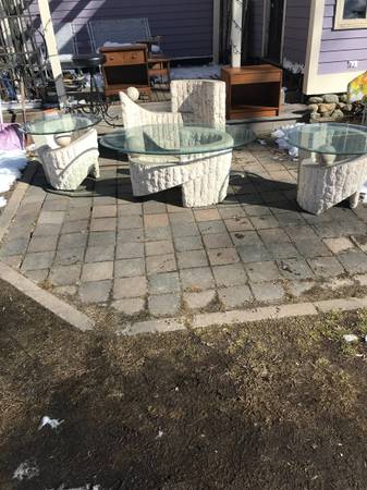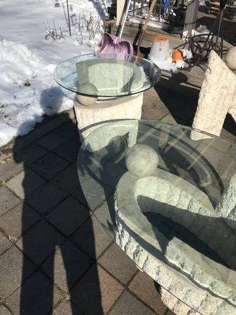 Set is in pretty good used condition. The tallest of the tables is missing the top. I briefly searched glass tables on Facebook and there were about 100 tops to choose from for less than 50$. The other glass tops have a few scratches and tiny chips on the edges, but overall pretty good. The stone pieces are a little chipped up but also pretty good. The ball is loose on the low oval table and will need to be repaired. They screw in and presumably the screw attachment is what is loose in the cracked area. It holds the glass up as-is but should be repaired. Set needs a little cleaning up but quite a unique look.