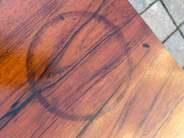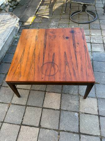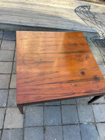 Rosewood veneer cocktail or coffee table with ebonized legs. Piece is in fair condition and is being sold as-is. There are some patches of damaged or missing veneer, shown in the photos. There are some stains to the finish. Edges of the base have some scratches, and scuffs. Piece needs some work and is priced accordingly.