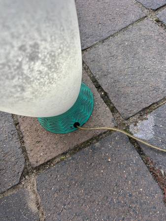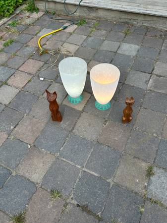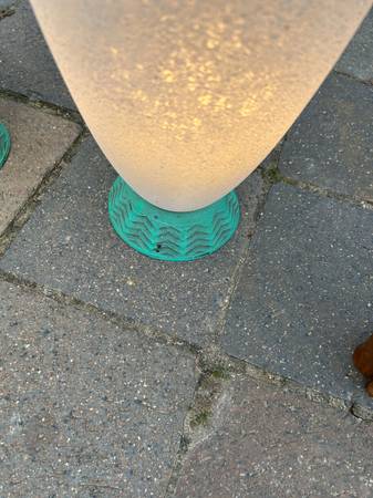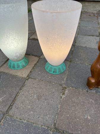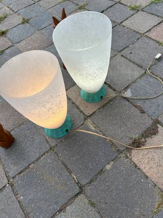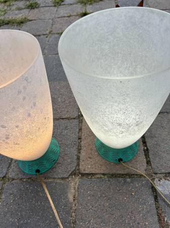 Pair of table lamps with scavo glass globes. Some sellers attribute these to Cedenese but they are not marked. The bases are some sort of metal. Lamps are a little dirty and I haven't cleaned them thoroughly because I think the best way would be to dismantle them and carefully clean each component. They work as shown. They match, I just used 2 different types of bulbs when testing them. Finish has some scuffs but overall very good condition.