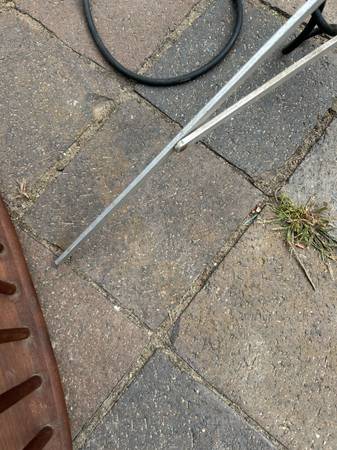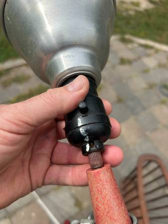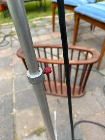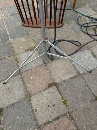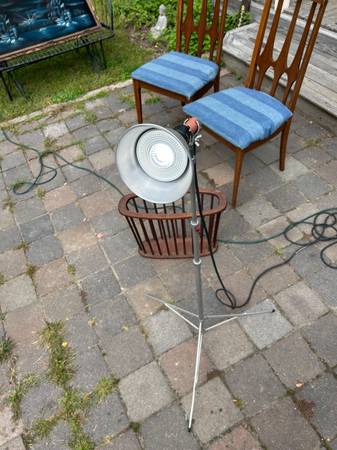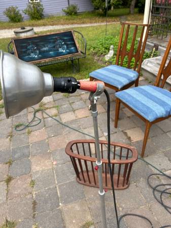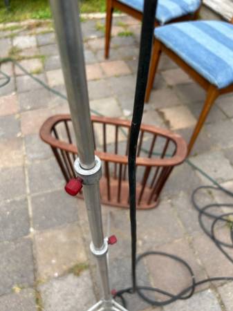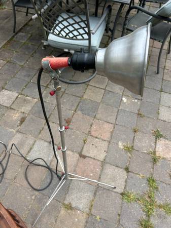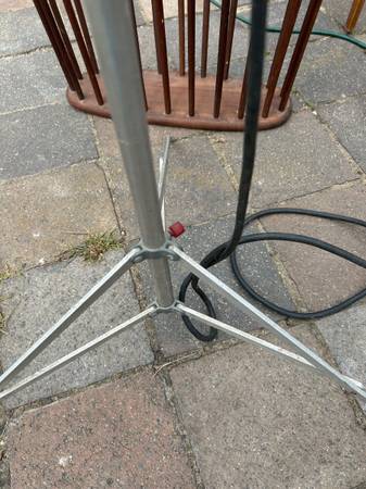 Telescoping. folding aluminum space age tripod lamp. Perhaps this was used for photography. Lamp is in pretty good used condition. The knobs didn't turn easily so I didn't try very hard as I was afraid of breaking them, and they are very cool looking. I would either heat them with a hairdryer or spray a little silicon spray on them. Metal has some scratches, including a previous owners name. The legs are a little crooked. One of the plastic foot guards is missing. Lamp works as shown, but it's at least 50 year old wiring. Handle to removable light is loose. Light needs a little cleaning up but it has a great space age look.