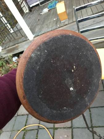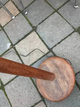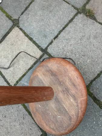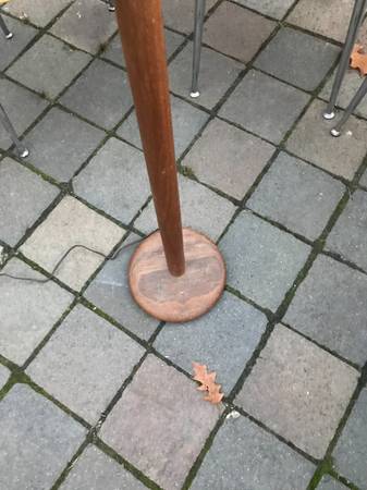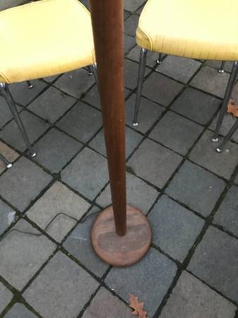 Turned teak floor lamp in excellent working condition. Lamp is not marked. I plugged it in and it works as shown. Finish has some scuffs and scratches. There is no harp or shade included. It has some slight wear but overall excellent.