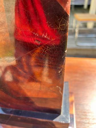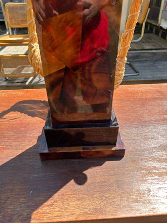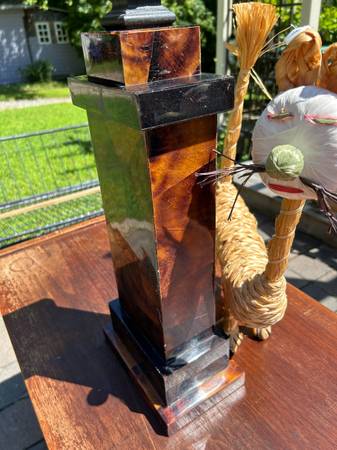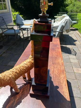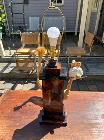 Mid-century table lamp. I am pretty sure this is inlaid coconut shell. The previous owner said his mother bought it in the sixties when she traveled all over the place. That's all the information I have. Piece is in pretty good used condition. Finish has some scuffs and scratches, no major damage. Metal portions are tarnished. I plugged it in and it works. It's an unusual piece and in pretty good condition.