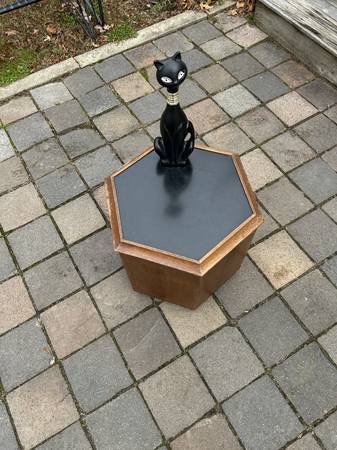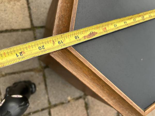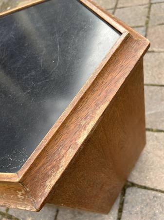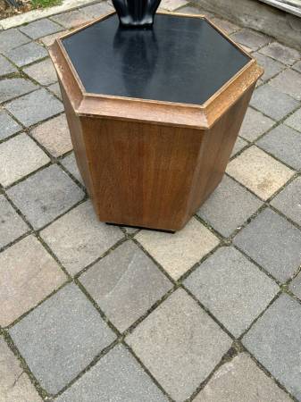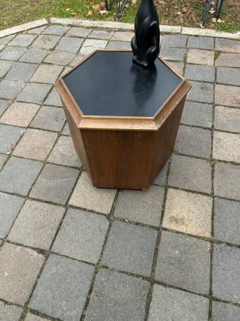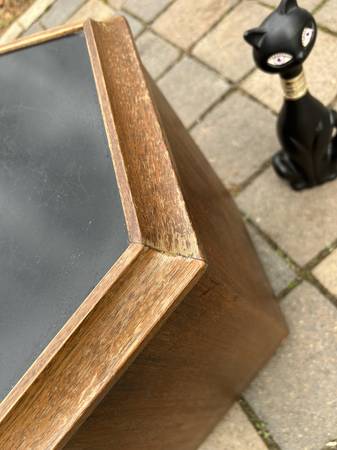Unique walnut mid century end table with Formica top that opens for storage. Piece is in very good condition. The Formica has some slight scuffs and scratches but otherwise very good. There are a couple of small chips to the veneer. Finish is worn but overall piece is in very good condition.