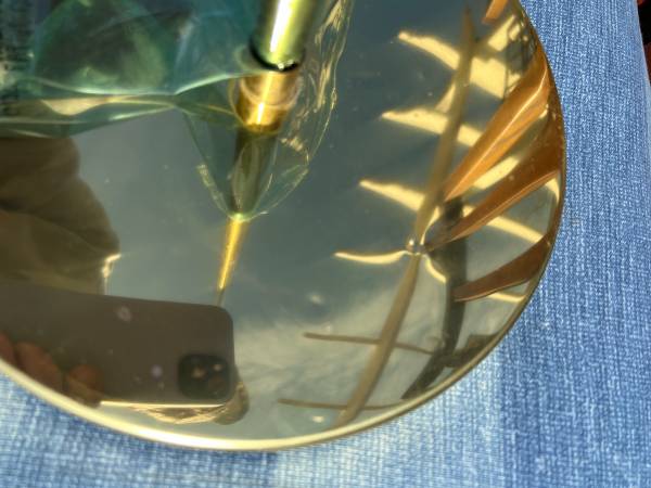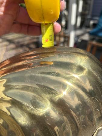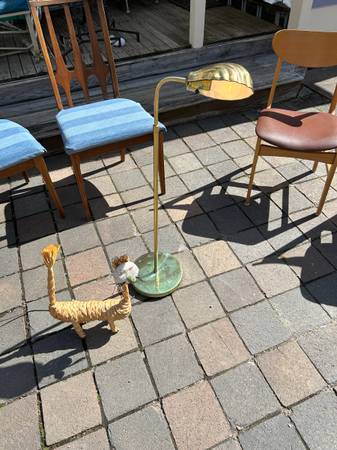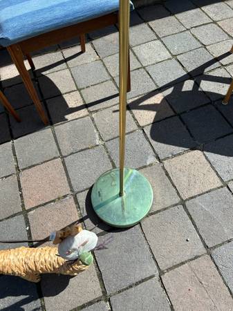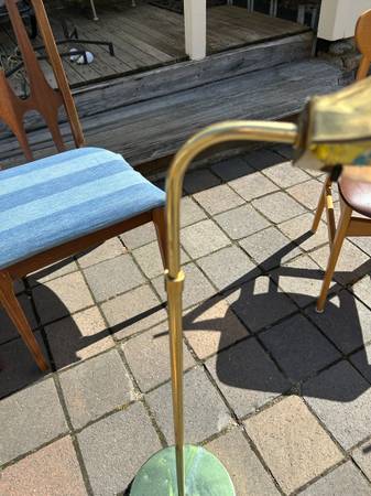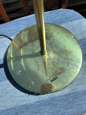 Mid Century brass floor lamp signed Alsy on the bottom. Lamp is in good used condition. The brass finish is a little worn/ tarnished on the shell part, most of this will clean up and polish quite well. Lamp works as shown in the photos. Interior of the clamshell was painted white and the paint is worn through on the edges. Metal has some slight scuffs where it slides up and down, as though the adjuster was too tight. The owner left the original protective plastic on the base, it is pretty shiny underneath but was still able to sustain a number of small dents. Overall very good condition.