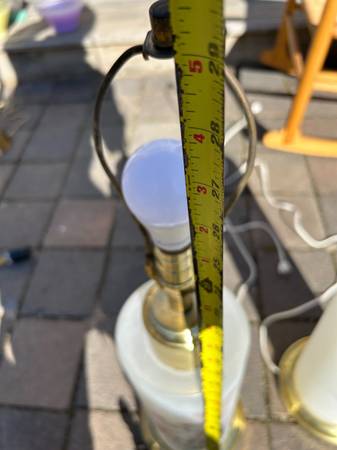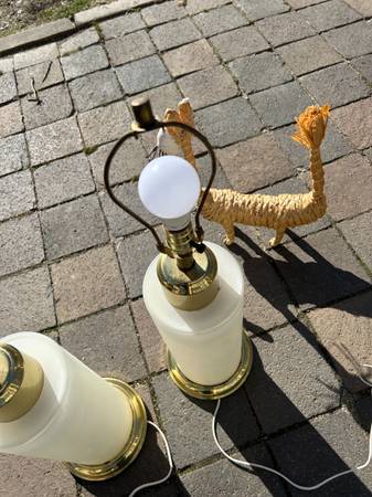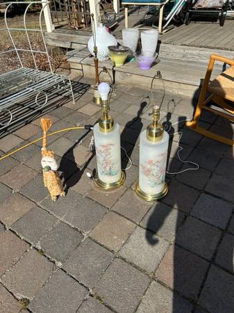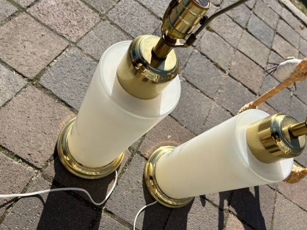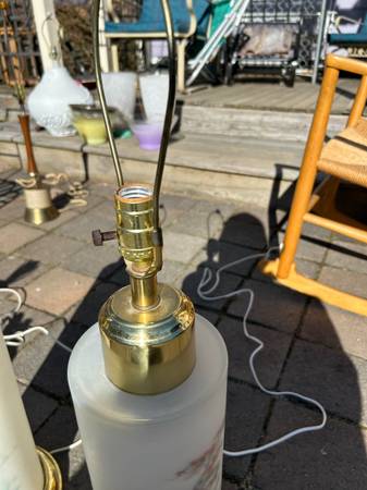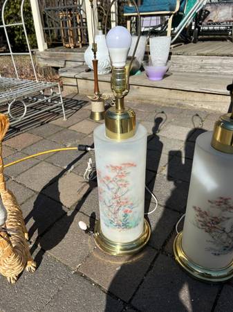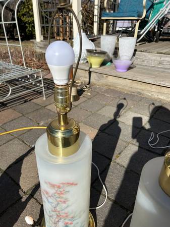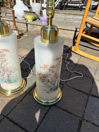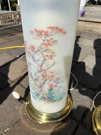 (2) Vintage Chinoiserie reverse painted satin glass lamps. I have no shades. Pair is in excellent condition. The interior is lit with a small bulb illuminating the flowers, tough to show on a sunny day. The switch is a three way switch so you can choose the main large light, just the small interior light (sort of acts as a night light) or both on at the same time. Both work fully. The metal portions have some tarnish / rust but overall pretty good condition. Pair has a few little scuffs but overall excellent condition.