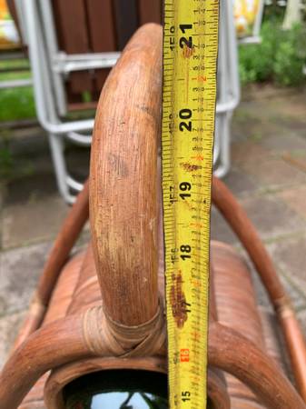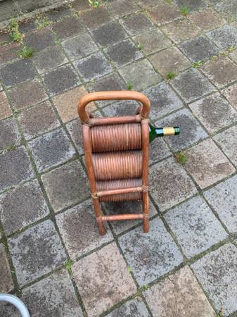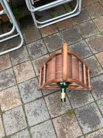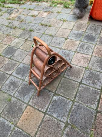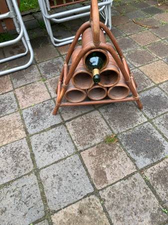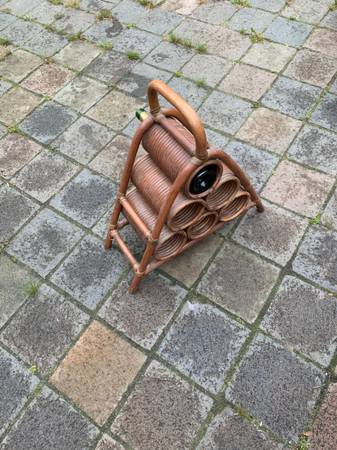 Vintage rattan and wicker wine rack. Piece is in very good used condition. There are some small splits in some of the reed that wrap the joints. None of the affected parts are loose. Piece could use a careful cleaning but overall very good used condition.