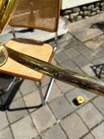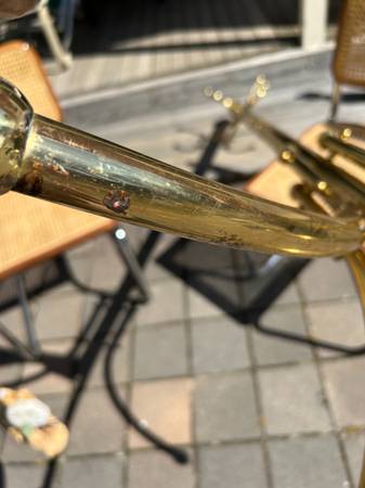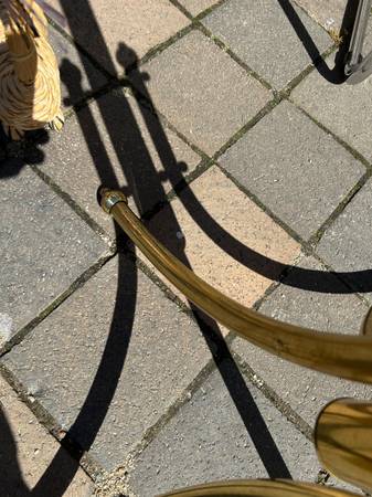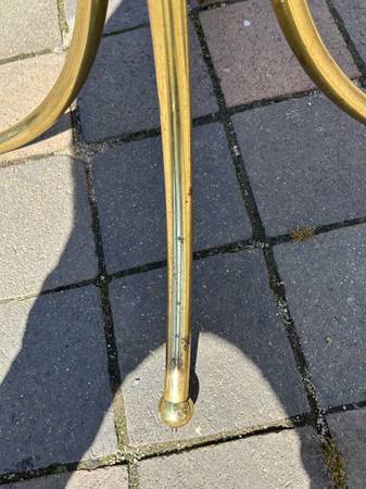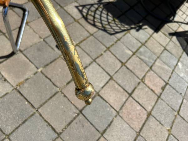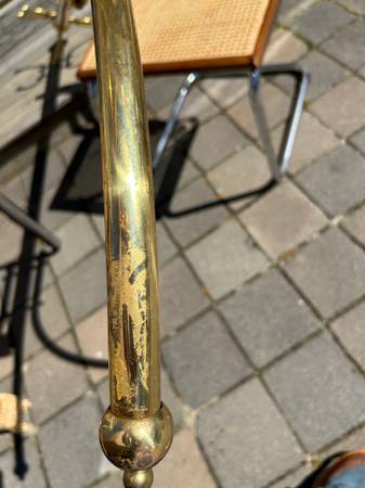 Vintage brass coat or hall tree. Piece is in fair condition with some damage / tarnish to the brass. Tarnish is mostly on the underside of the brass legs, mainly on one leg. The pictures show one of the brass ball details missing, but it is not. It had come loose and has been put back on. The remainder of the piece has a few small dents but overall pretty good.