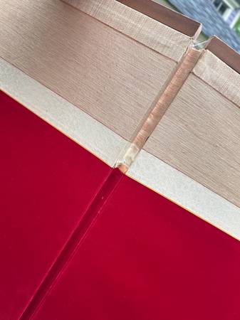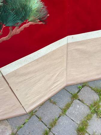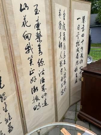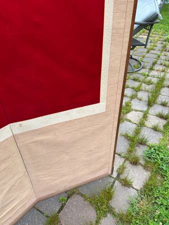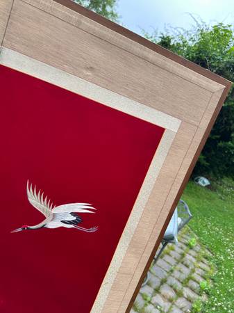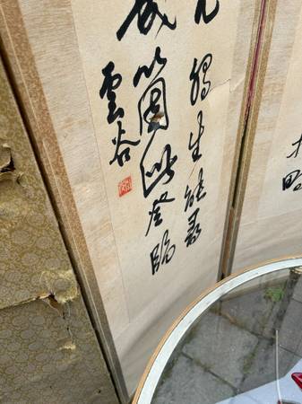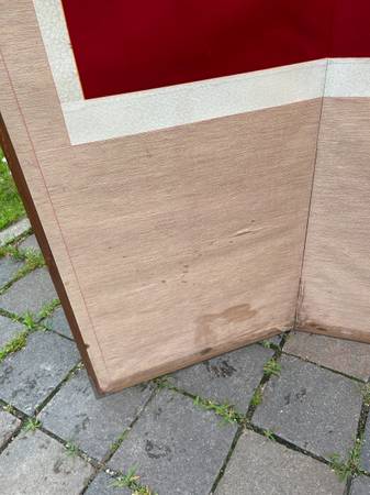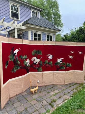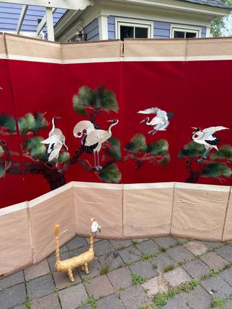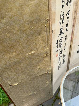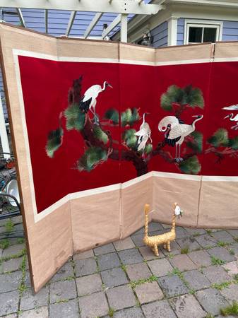 Chinoiserie embroidered room divider. Piece is in fair used condition needing a little attention. The part that is not decorated is a heavy textured wallpaper like material that has some tears and water stains. Fortunately, the cloth / embroidered portion is excellent. I think a person with average craft skills could clean this up quite easily. The paper serves as a hinge and has come loose in a few spots. The cloth as I said is excellent. The back is also a paper material that has torn in a few areas. A lot of sellers list this as 1950's but the interior is lined with Korean newspaper which Google images claims to be from 1975. Perhaps that is wrong. It needs a little effort but, as I said, not beyond the skills of a 6th grade art project.