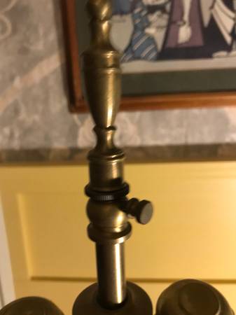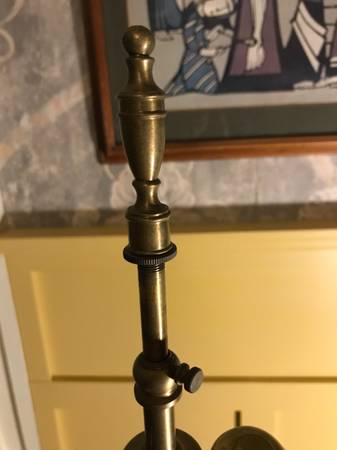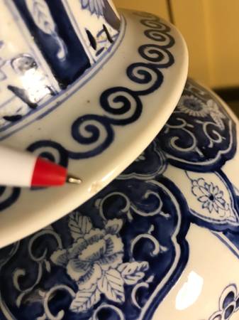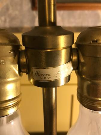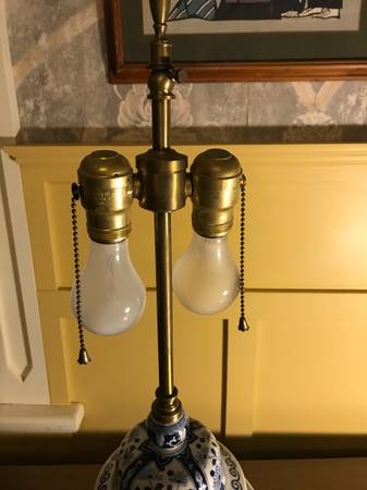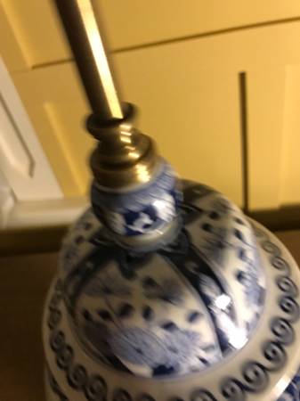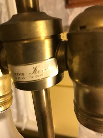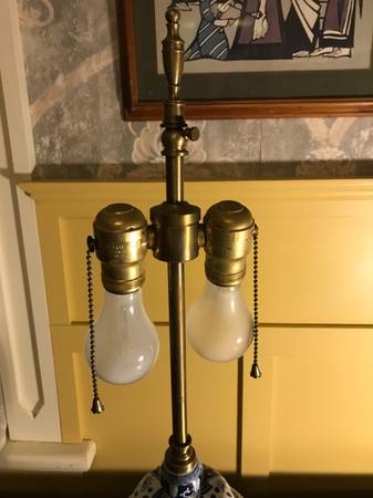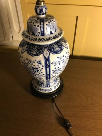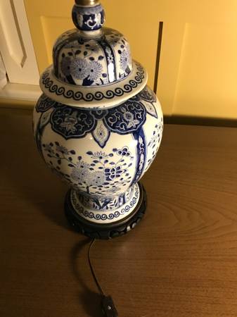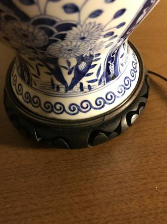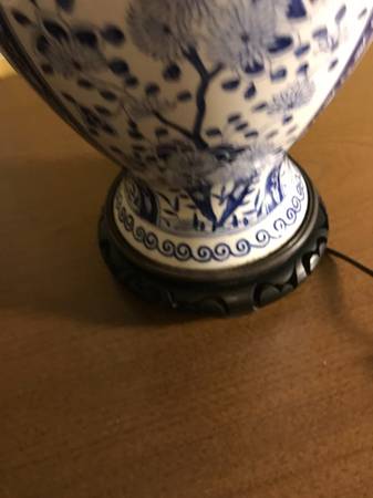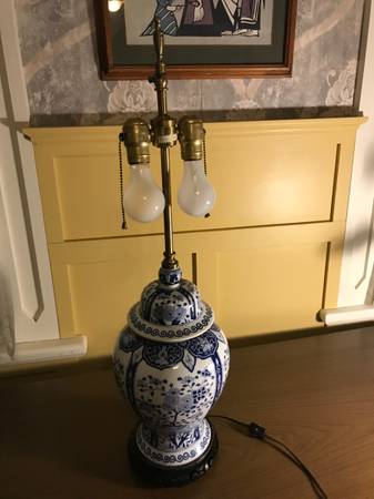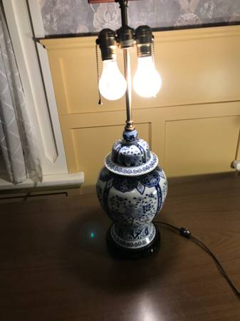 Vintage Warren Kessler Chinoiserie ginger jar lamp. I have no shade. Piece is in excellent condition. There is a small chip in the outside edge I point out in the photos. There are a few nicks to the color on the wooden base and metal top part, minor wear. I plugged it in and both lights work, they seem to be in excellent condition. Piece has a few little scuffs but overall excellent condition.