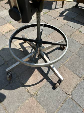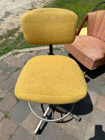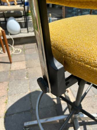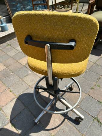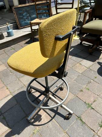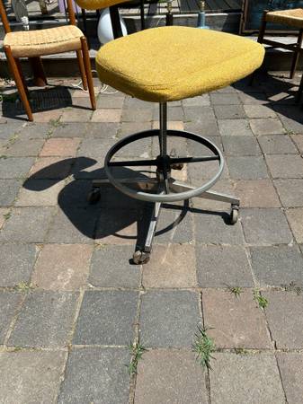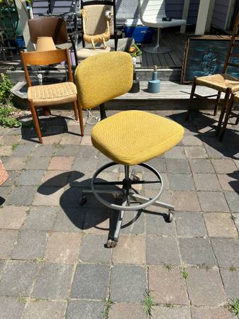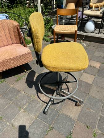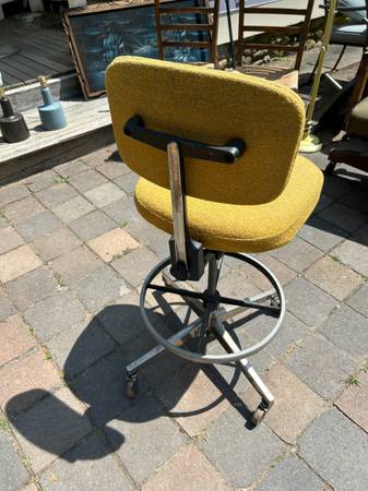 This is presumably a copy of the Knoll / Eero Saarinen 77 series drafting stool. It has no markings other than "faultless casters" on the casters. It has a great mid century look. Piece is in very good used condition. Fabric is dirty and has a few small pulls. The chrome has a few scuffs and dents but most could be polished. The adjusting knobs have worn plastic or rubber. Piece needs a little cleaning up but overall a good-looking chair.