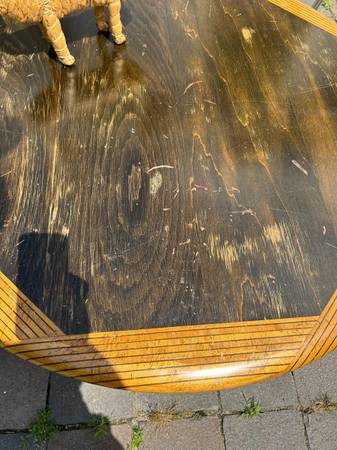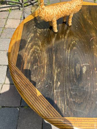 Lane round coffee table similar to the Africa table by Maxalto (seems like an outright knockoff). Piece has the Lane serial code date for 1981 (pretty sure I'm reading that right). Piece is in fair condition and will need some work. Base is very good. Top has some scratches that look like someone tried to cover with gel stain, mainly in the center portion. The solid wood edge band is in pretty good shape. It needs a little work but a fairly unique piece of Lane furniture.