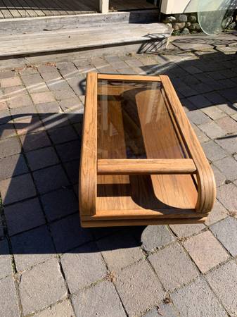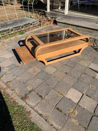 Unique mid century bentwood oak coffee table. Piece is not marked. Table is in excellent used condition. It has small shelves that slide out on either end. Smoked glass top has some very slight scuffs and scratches. There are scuffs and nicks to the finish as shown in the photos. Overall, very good condition and rather a unique look.