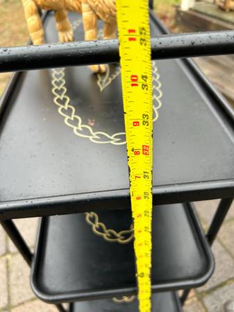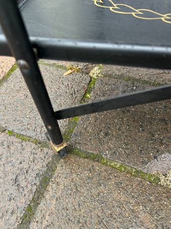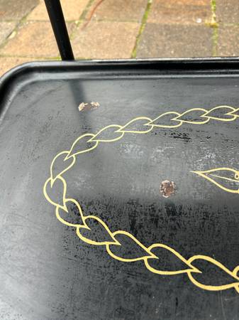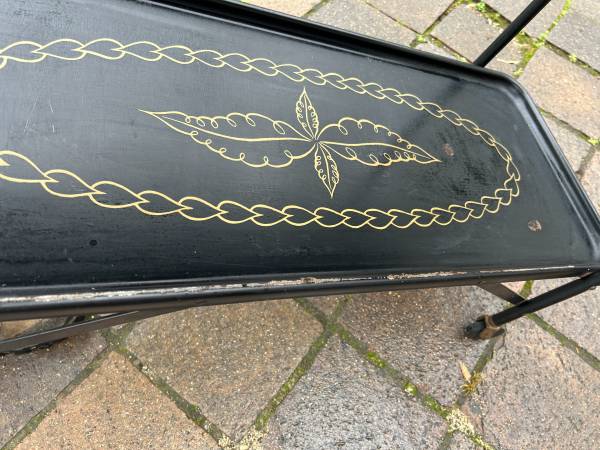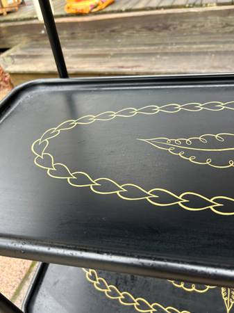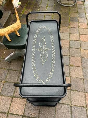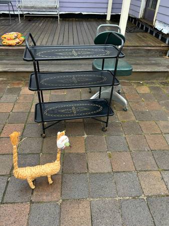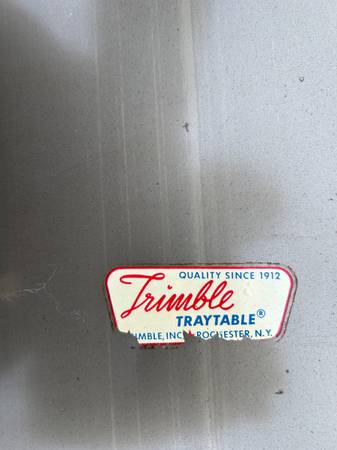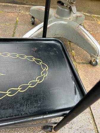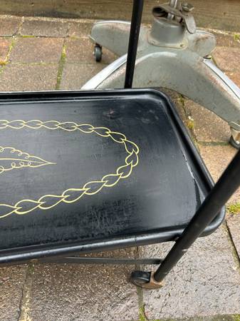 Vintage rolling serving cart by Trimble. Piece is in pretty good condition. There are some rust spots where the paint was damaged. Wheels are a little rusty but work fine. Bottom still has the original Trimble label. Overall piece is in good condition.