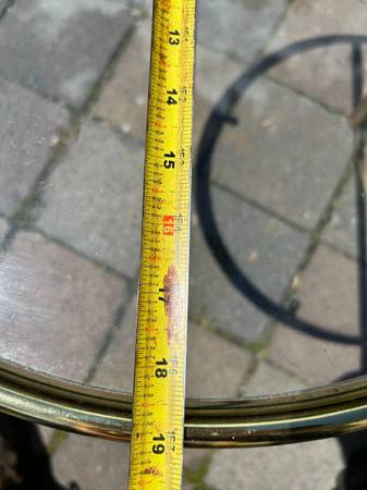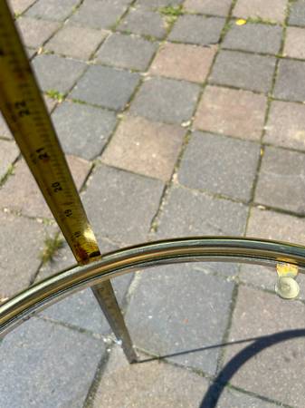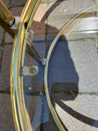 Brass and glass swivel table in the style of Milo Baughman. I found no markings. Table is in pretty good condition. Brass has some slight tarnish / rust spots most of which will clean up some may not. Glass has some scratches. A few of the little suction cup pieces under the glass are missing, I don't think they are difficult to find. Overall very good condition.