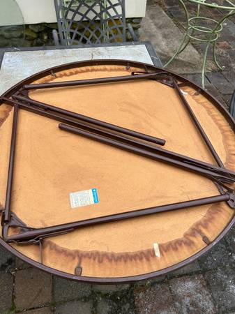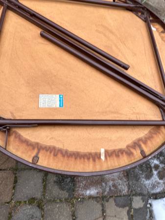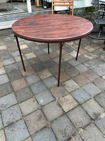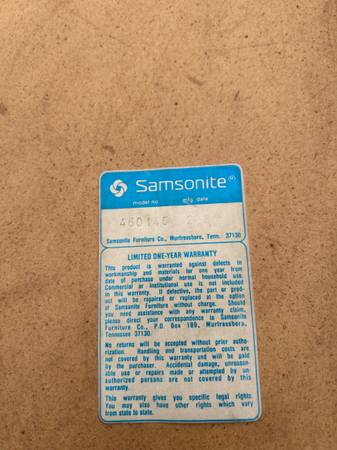 Vintage folding game table by Samsonite. Piece is in good condition. Underside of table has some moisture stains. The paint is scratched and scuffed on the legs and sides. The vinyl has a few small tears and stains but overall very good. Table needs a little cleaning up but overall very good.