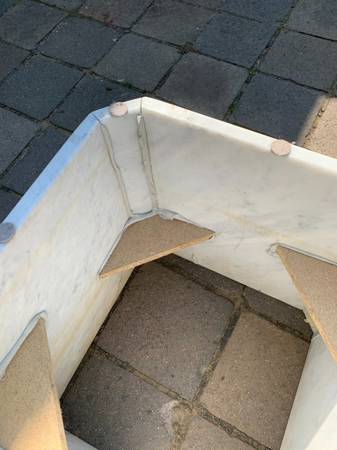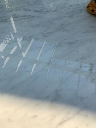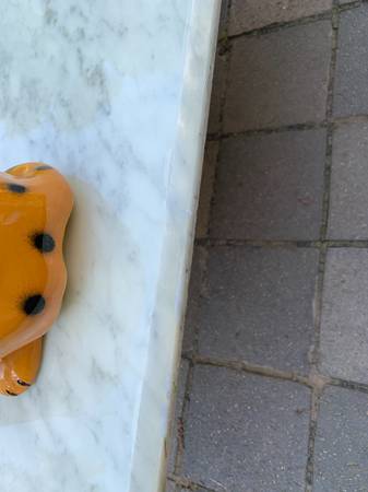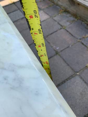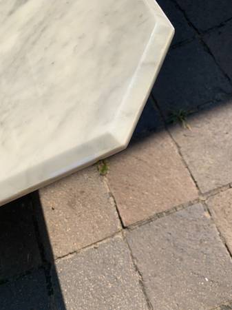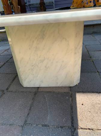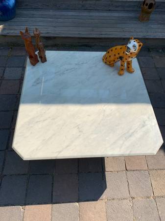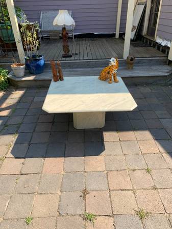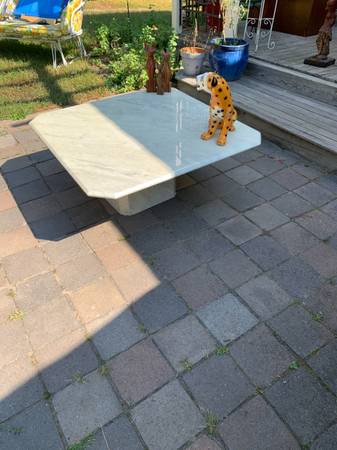 Vintage solid marble pedestal coffee table. Table is in excellent condition. There are few small chips to the edges. It may have had some sort of protective finish which is chipped in a few places, they show up white in the photos. Surface has some slight scratches but overall excellent condition. Table top is quite heavy and will require 2 pretty strong people to move, 3 not so strong or 2 elves and an enthusiastic goat.