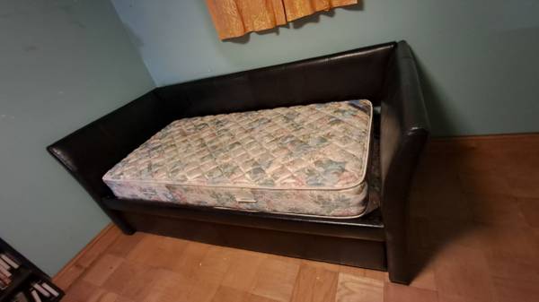 Black leather day bed with rolling trundle in excellent condition. Both beds are twin sized. Clean Mattresses can be included. Black night stand included. Hardly sed in spare bedroom $300 cash /...