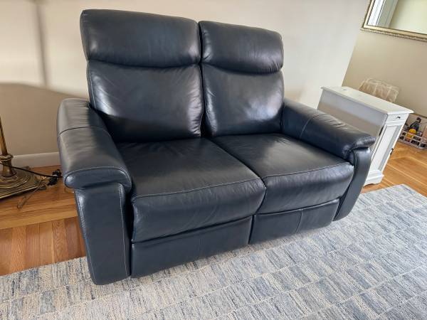 Blue leather reclining loveseat. Overall dimensions are 82” wide x 42” high. Excellent condition. Reclining mechanisms work smoothly. No stains or tears. From a smoke and pet free home. Asking $150....