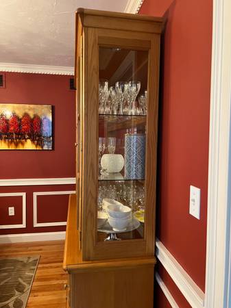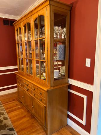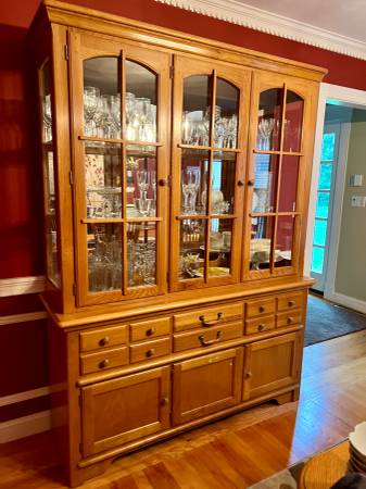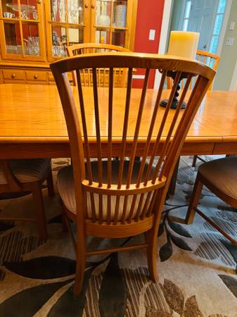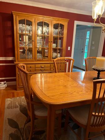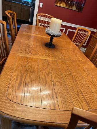 EXCELLENT CONDITION SOLID OAK LEXINGTON DINING ROOM TABLE AND HUTCH. YOU CAN REMOVE TOP OF HUTCH AND USE BOTTOM AS SERVER. COMES WITH 2 INSERTS TO ENLARGE TABLE. 6 CUSHIONED CHAIRS BUT CAN SEAT 8. CUSTOM MADE TABLE TOP PROTECTORS. THE TOP IS PERFECT BECAUSE IT WAS ALWAYS PROTECTED WITH THESE. THIS WAS A VERY EXPENSIVE DINING SET AND WELL TAKEN CARE OF. CASH ONLY PLEASE.