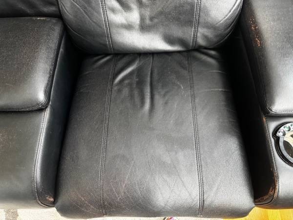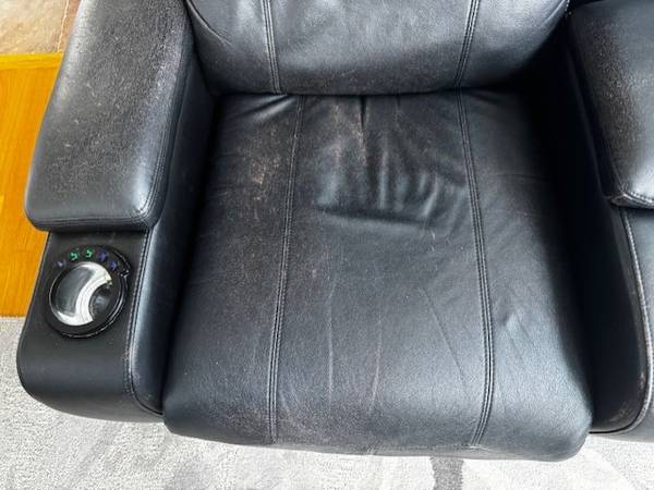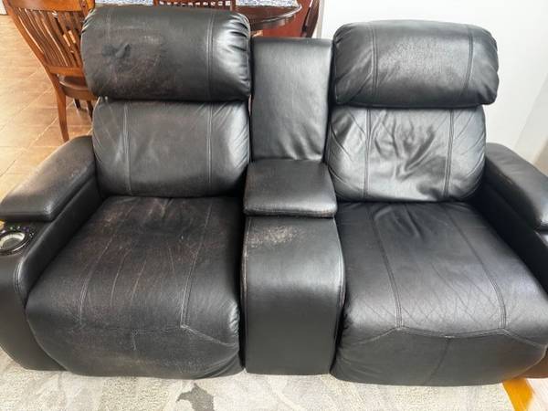 Leather love seat attached by a console. Middle and arm rests open for storage. Electronic foot and headrest (buttons near cup holders). Cup holder on each side.