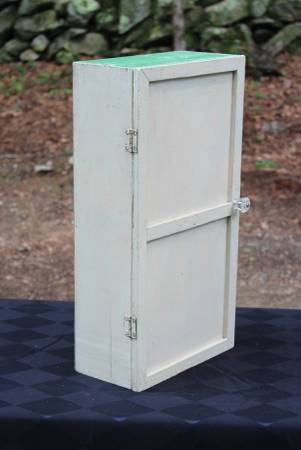 VERY GOOD CONDITION! Vintage 3 Shelf Wooden Country Cupboard / Wall Cabinet Ivory with Green Trim Solid & Sturdy Glass Knob Handle on the Door Measures: 23"H X 12"W X 6 1/4"D