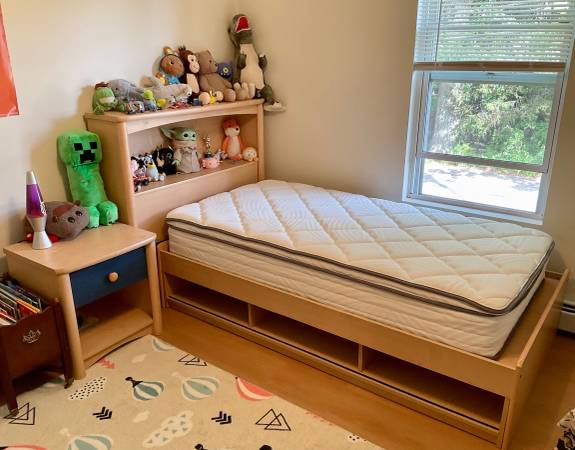 Twin bed frame with built in shelving, side table and new mattress, only $45.!! The mattress was purchased in April 2025 for $140. and I DO HAVE the Amazon receipt available upon request. It’s been...