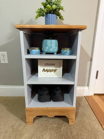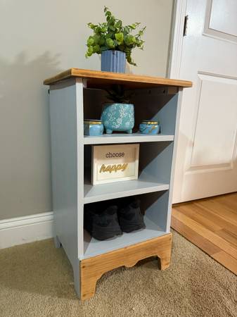 Light Grey Storage Shelf / Entryway Organizer Beautiful, freshly refinished piece with a natural wood top and base and light grey frame. Perfect for an entryway, small space storage, or decor...