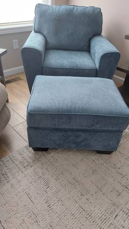 Upholstered chair with matching ottoman in blue. Purchased at Ashley's - part of the Cashton collection. Like new.